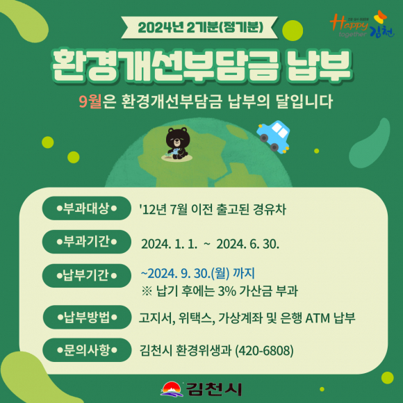 | 김천시는 경유자동차를 대상으로 2024년 2기분 환경개선부담금 8,073건, 394,532천원을 이달 부과한다고 밝혔다.