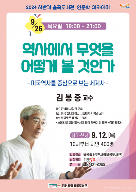 이번 강연은 미국 역사 전문가인 전남대학교 사학과 김봉중 교수를 초청해 <역사에서 무엇을 어떻게 볼 것인가>라는 주제로 진행된다. 김 교수는 tvN <벌거벗은 세계사> 미국사편, <세계 다크투어> 존F케네디 암살 사건편에 출연하여 역사적 사건과 인물들에 대한 이야기를 다양한 시각으로 풀어내며 대중의 인기를 얻고 있다. 김봉중 교수는 율곡 인문학 아카데미 강연에서 미국이 세계 최강대국이 된 과정과 그 과정에서 미국 대통령들의 역사관이 세계사에 어떤 영향을 미쳤는지를 다룰 예정이다. 강연은 9월 26일(목) 저녁 7시 율곡홀에서 2시간 동안 진행되며, 참여 인원은 400명으로 강좌에 참여하고자 하는 시민은 9월 12일부터 티켓링크나 김천시립도서관 홈페이지를 통해 신청할 수 있다.