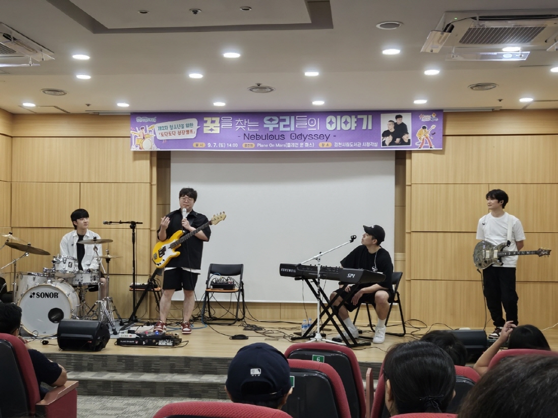 | 김천시립도서관(관장 이순영)은 지난 9월 7일 독서의 달을 맞아 관내 청소년과 학부모들을 대상으로 진행한 「제2차 토닥토닥 성장캠프」프로그램을 성황리에 마쳤다. 청소년들에게 다양한 분야의 진로를 접할 기회를 제공하고 미래의 꿈과 열정을 키우기 위해 기획된 이번 프로그램은‘꿈을 찾는 우리들의 이야기’라는 주제로 인디밴드 플레인 온 마스(Plane On Mars)를 초청해 음악 등 여러 직업군에 관심 있는 청소년들에게 진로 탐색의 기회를 제공했다. 이번 프로그램에서는 플레인 온 마스의 다채로운 음악을 선보이는 라이브 공연과 멘토링 강연을 함께 진행하였다. 강연에서는 꿈을 가지게 된 계기, 밴드 활동을 하면서 가장 기억에 남았던 순간 등 멤버들의 솔직한 경험을 공유해 청소년뿐만 아니라 자녀 진로에 대해 고민하는 학부모들의 큰 호응을 얻었다.