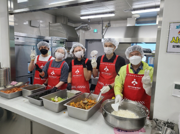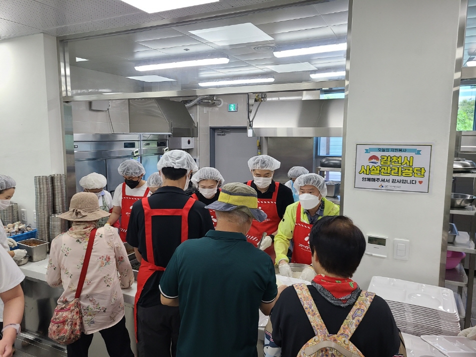 김천장애인회관은 올해 6월 개관하여 12개의 장애인 단체가 입주해 재활과 권익 향상 등 다양한 활동을 하고 있는 곳으로 시설관리공단 이사장과 직원들은 이틀간 130인분 정도의 식사를 준비하기 위하여 아침부터 바쁘게 움직이며, 재료 손질과 설거지 등 조리 보조와 배식을 도왔다.