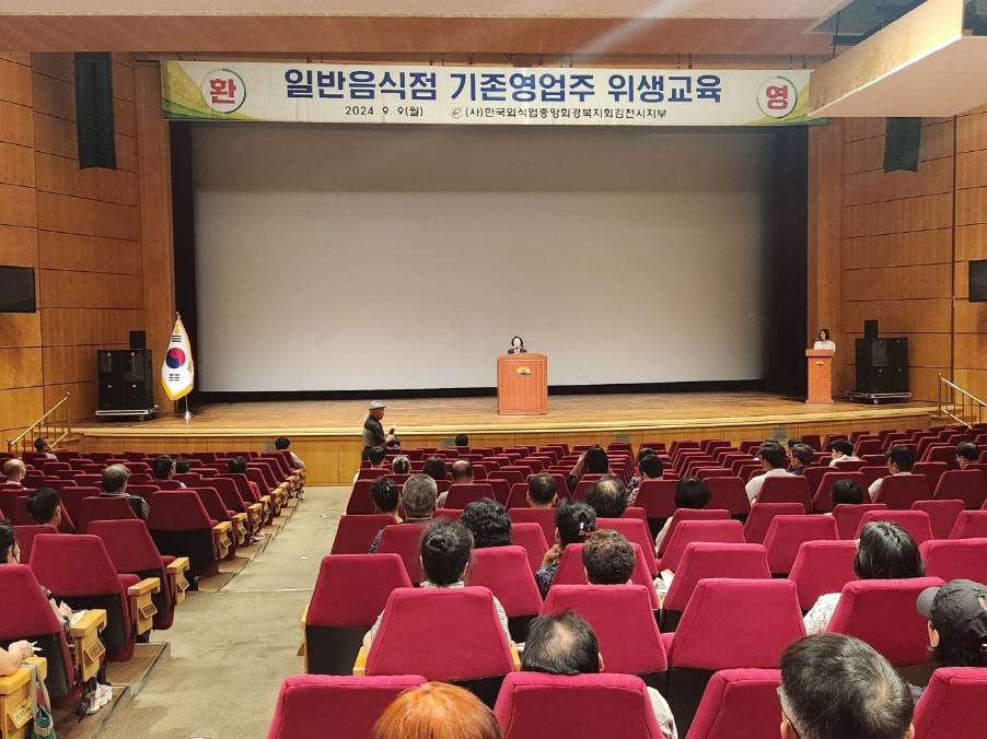 | 김천시(시장 김충섭)는 지난 9월 9일 김천문화예술회관에서‘2024년 일반음식점 기존영업자 위생교육’을 실시했다. 이번 교육은 일반음식점 기존영업자 200여 명을 대상으로 진행됐고 ▲식품위생법령 및 정책 방향 ▲노동법 해설 ▲식중독 예방법 및 친절서비스 등으로 구성됐으며 법령 교육 및 기본 소양 교육을 습득하는 유익한 시간을 보냈다.