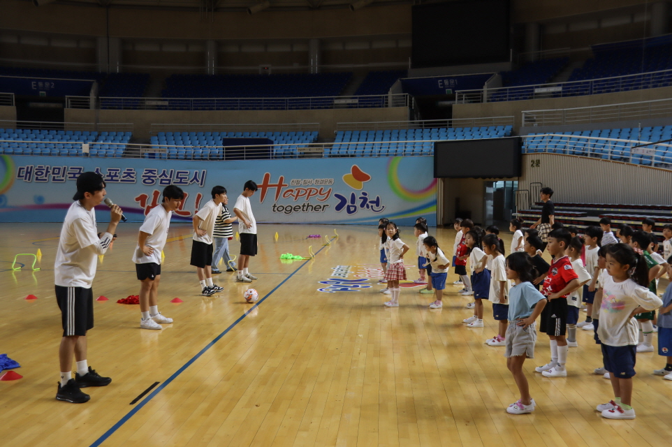 이번 어린이 체육교실은 김천시시설관리공단(이사장 김재광)의 시설 사용 협조와 함께 국가공인 생활체육지도사 자격증을 소지한 김천대 생활체육학과 재학생(학과장 홍상민 교수)이 개발한 프로그램으로 진행되었다. 프로그램은 놀이를 이용한 축구 게임과 서킷트레이닝 형태의 릴레이 게임으로 근육과 소근육을 골고루 사용하는 체육활동으로서 신체건강증진과 사회성을 기를 수 있는 프로그램이다.