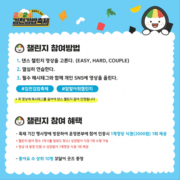 많은 시민의 참여를 독려하기 위해 축제 기간 중 행사장에 방문한 댄스 챌린지 참여자에게는 하나의 계정당 식권 2,000원권 1매를 증정하고, ‘좋아요’를 많이 받은 10명에게는 김밥축제 캐릭터 ‘꼬달이’ 굿즈 증정도 계획돼 있다. 박대원 관광진흥과장은 “재미있고 유쾌한 홍보를 위해 김밥과 관련된 유명 노래에 맞춰 댄스 챌린지를 기획했다.”라고 전하며, “김밥축제는 누구나 쉽게 참여하고 함께 만들어가는 참여형 축제다.”고 말했다.