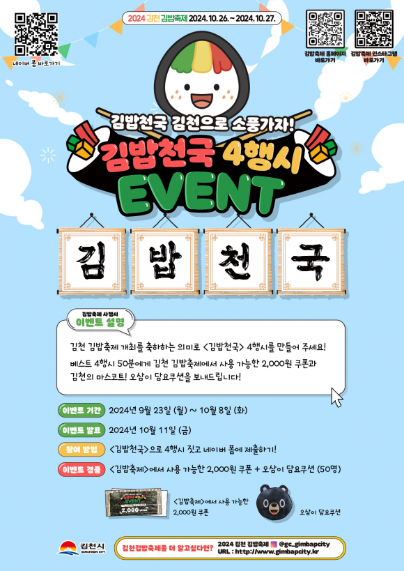 - 2024 김천김밥축제(10. 26. ~ 27.), 사명대사공원 - 참여자 50명 선정, 김밥 쿠폰·오삼이 담요 쿠션 증정
