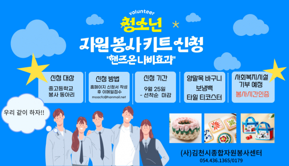 | (사)김천시종합자원봉사센터(센터장 김경희)에서는 학생들이 참여하는 2024 청소년 참여 자원봉사 프로그램을 진행코자 자원봉사 동아리 및 희망 학생들의 신청을 받고 있다.