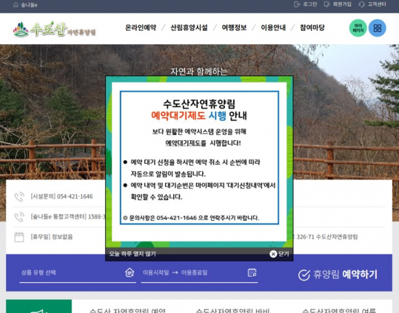 | 김천시시설관리공단은 2024년 9월부터 수도산자연휴양림에 예약대기제도를 새롭게 도입했다고 밝혔다. 이번 예약대기제도는 예약이 완료된 객실이나 시설이 취소될 경우, 대기 중인 이용자들에게 자동으로 알림이 전송되어 원하는 날짜에 숙박을 할 수 있는 기회를 제공하는 제도다.