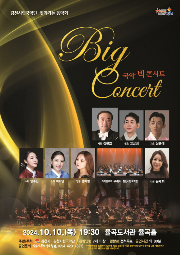 | 김천시 문화예술회관(관장 윤숙이)이 오는 10월 10일 오후 7시 30분에 시립율곡도서관 율곡홀에서 시립국악단 율곡콘서트『국악 빅 콘서트』를 선보인다고 밝혔다.
