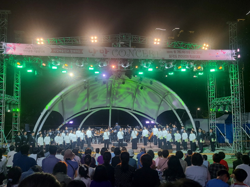 | 김천시를 대표하는 문화예술단체인 김천시립예술단은 지난 9월 26일 율곡동 안산공원에서 특별 연주회인‘시립예술단과 함께하는 낭만 콘서트’를 시민들의 환호 속에 성료했다. 이번 공연은 시립교향악단의 연주와 시립합창단의 합창 하모니로 더욱 완성도 높은 무대를 선사했다.