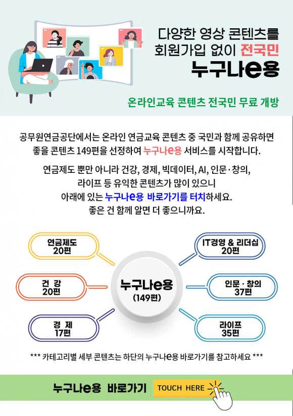 | 공무원연금공단(이사장 김동극)이 공단의 온라인 학습 콘텐츠 149편을 전국민에게 무료로 개방하는‘누구나e용’서비스를 시작했다.