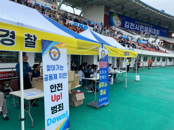 | 김천경찰서는 10월 15일 김천시민의 날을 맞아 김천스포츠타운 일원에서 개최된 김천시민체육대회 및 공연행사장을 찾아 최근 발생한 보이스피싱 수법 등을 홍보하고 각종 민원 상담을 하는 “찾아가는 공동체 치안” 활동을 전개하였다.