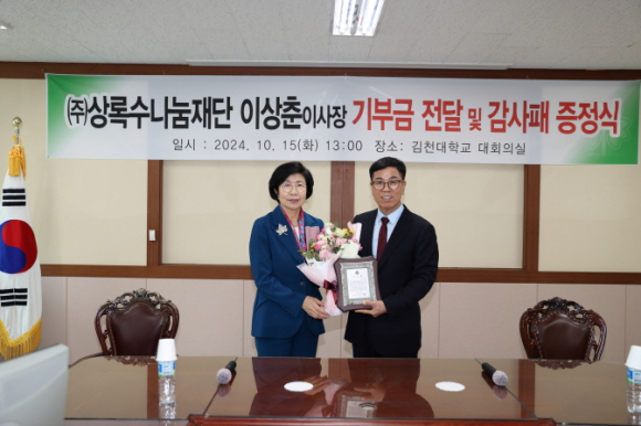 |  | | | ⓒ 김천내일신문 | | 김천대학교(총장 윤옥현)는 (재)상록수나눔재단 이상춘 이사장이 누적 기부금 6억원을 달성한 것을 기념하여 감사패를 증정하는 행사를 10월 15일 김천대학교 대회의실에서 개최하였다. 이번 행사에서는 김천대학교 윤옥현 총장의 인사말과 이상춘 회장의 기부에 대한 소감이 함께 전달되었다.