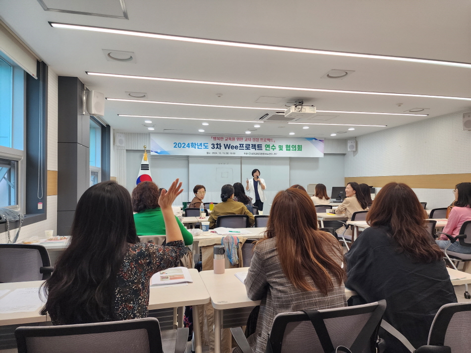 | 경상북도김천교육지원청(교육장 모태화) Wee센터는 10월 15일 관내 초, 중, 고등학교 Wee클래스 전문상담(교)사 및 업무 담당자 42명을 대상으로 김천교육지원청 Wee센터 3층 대회의실에서 2024학년도 3차 Wee프로젝트 연수 및 협의회를 실시하였다.