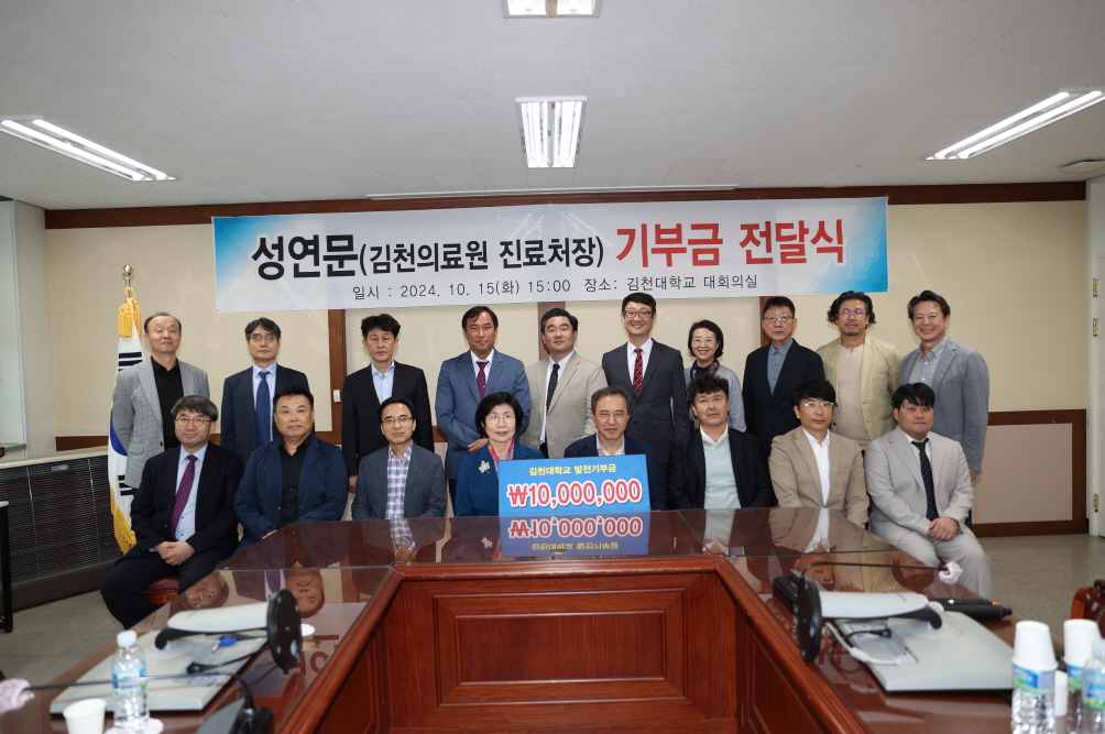 | 김천대학교(총장 윤옥현) 대외협력처(처장 김용준)는 대회의실(본관 2층)에서 김천의료원 성연문 처장의 기부금 전달식을 가졌다고 10월 16일 밝혔다. 성연문 진료처장은 매년 김천대학교의 발전을 위해 발전기부금을 기탁해 왔다.