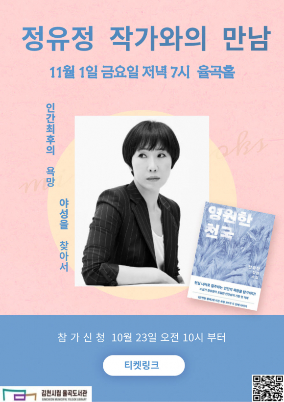 | 김천시립율곡도서관(관장 이순영)은 깊어 가는 가을, 문학의 정취를 느낄수 있는 특별한 자리를 준비했다. 우리 시대 독보적인 이야기꾼으로 평가받는 소설가 정유정이 11월 1일 금요일 저녁 7시, 율곡홀에서 강연을 펼친다.