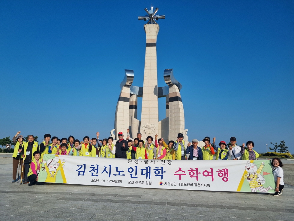 | (사)대한노인회 김천시지회(회장 이부화) 부설 노인대학은 10월 17일 노인대학생 170명이 참여해 전라북도 군산에 있는 선유도로 수학여행을 다녀왔다. 김천시노인회는 가을 수학여행을 추진해 지난 여름 유난히도 지속된 폭염으로 고생했던 어르신들의 기분을 전환하고 학생들의 화합과 친목을 도모했다.