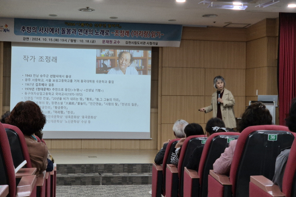 | 김천시립도서관(관장 이순영)은 10월 15일(화)과 18일(금) 2회에 걸쳐 중장년층 시민들을 대상으로 <아름다운 신중년 컬리지 5교시-추방의 서사에서 돌봄과 연대의 노래로, 조정래 『아리랑』읽기>를 성황리에 운영했다.
