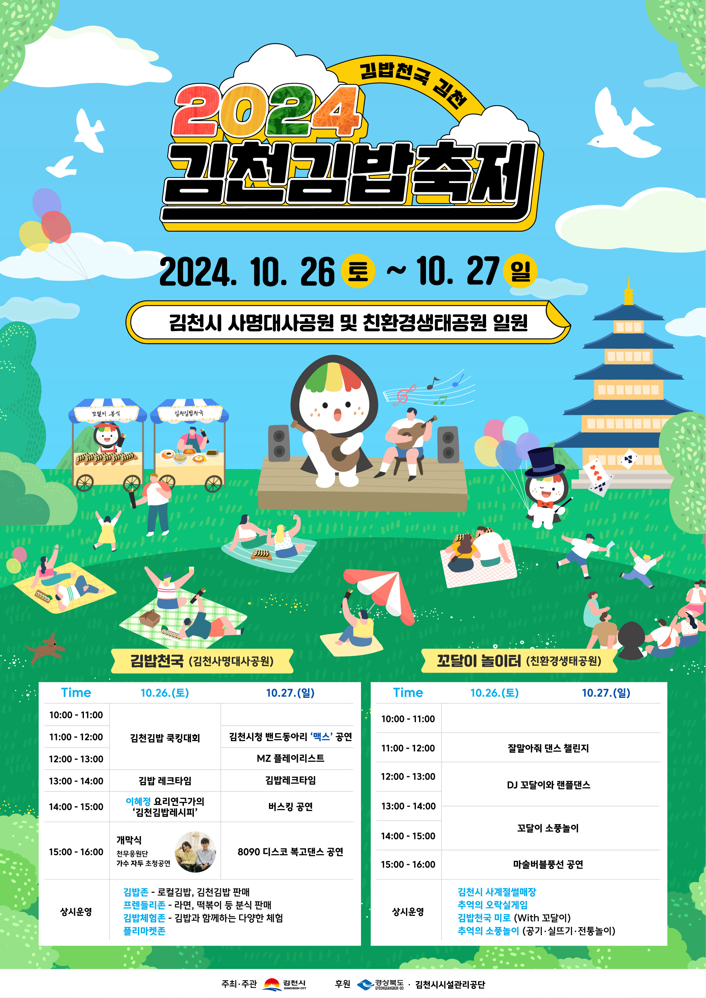 | 김천시는 10월 26일부터 27일까지 사명대사공원 및 친환경생태공원 일원에서『2024 김천김밥축제』를 개최한다.