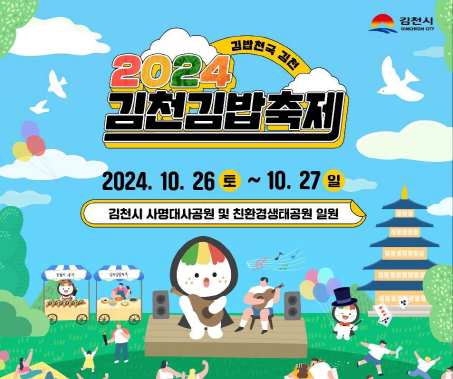 | 김천시는 오는 10월 26일, ‘김천김밥축제’, ‘과하천 물동이 축제’를 비롯한 10여개의 다양한 축제행사가 시가지 곳곳에서 동시에 개최되어 도시 전체가 축제의 장으로 변신한다고 밝혔다.