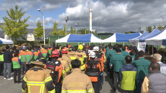 실제 훈련은 화재 발생 시 연기확산에 따른 유해가스 피해 예방을 위한 주민 실제 대피훈련과 2차 피해가 우려되는 금속 화재로 번져 오염된 소방수 과다발생으로 대광천을 통해 낙동강 수계에 피해를 줄 수 있다는 경각심으로 비상 소집된 직원들의 사전점검을 통한 방류 시기 결정과 환경 부서 협조하에 완충 저류조 시설로 사전 처리하는 방안을 모색하는 훈련을 시행했다.