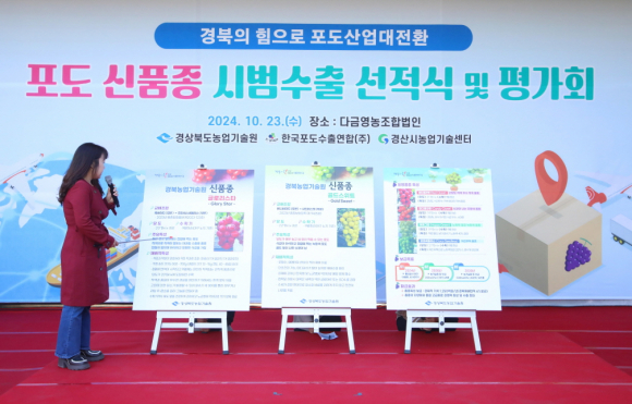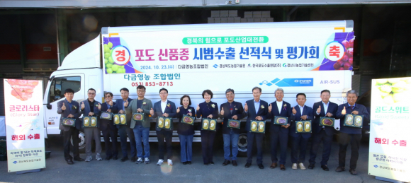 | 경상북도농업기술원은 10월 23일 경산시 압량읍 다금영농조합법인에서 경북육성 신품종 포도‘글로리스타’와‘골드스위트’의 수출을 기념하는 선적식 및 품평회를 개최했다.