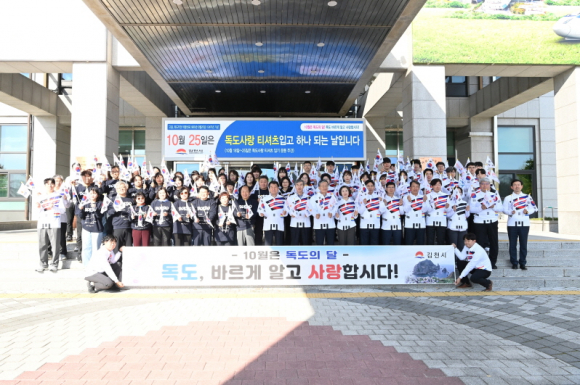 | 김천시는 지난 10월 25일 고종 독도주권 칙령반포 124주년을 기념해 시청 전정에서 ‘독도사랑 티셔츠 입기 운동’을 전개했다고 밝혔다.