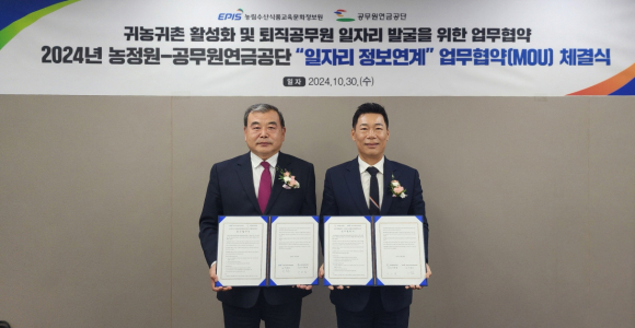 | 공무원연금공단(이사장 김동극)은 10월 30일 농림수산식품교육문화정보원(원장 이종순)과 퇴직공무원의 일자리 발굴 및 농촌지역 발전을 위한 업무협약을 체결했다.