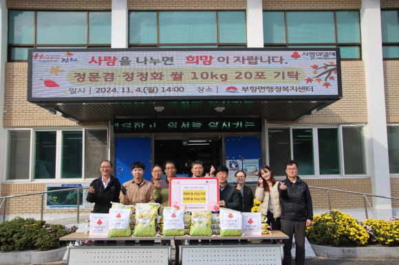| 11월 4일, 정문겸 자산동 영농회장과 아들 정정화씨가 부항면 저소득 가정을 위해 백미 10kg 20포를 부항면 행정복지센터(면장 이현기)에 전달했다.