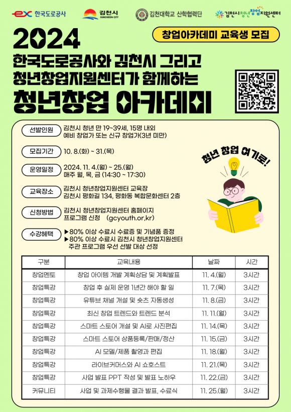 김천시와 한국도로공사가 주최하고, 김천시 청년창업 지원센터가 주관하여 운영되는 이번 “2024 청년창업 아카데미”는 창업을 희망하는 만 19세~39세 김천시 청년을 대상으로 창업 아이템 개발 계획부터 창업 실무까지 전문가의 강의를 통해 습득하여, 창업을 앞두고 막막함을 느끼는 청년들에게 도움을 주기 위해 계획되었다.