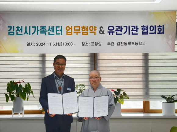 | 김천동부초등학교(교장 하헌택)는 11월 5일 김천동부초등학교 교장실에서 김천시가족센터와 업무 협약식 및 지좌동행정복센터외 5개 기관과 유관기관 협의회를 가졌다.