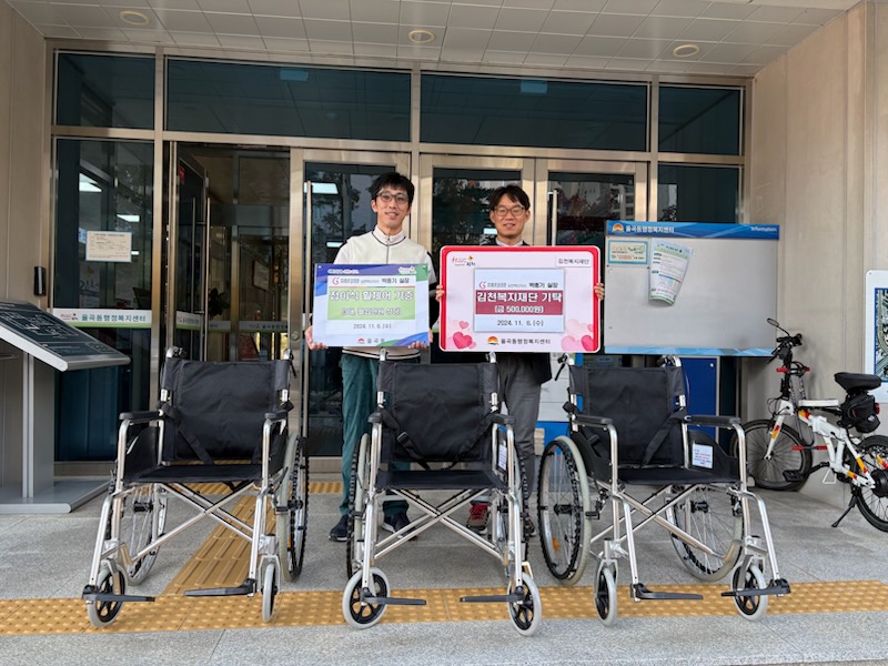 지난 11월 6일 지에이코리아 김천혁신지사 박종기 실장은 다리를 다친 주민들이 치료받는 동안 휠체어를 무료로 이용할 수 있도록 접이식 휠체어 3대를 율곡동행정복지센터에 기증하고, 김천복지재단에 성금 50만 원을 전달했다.