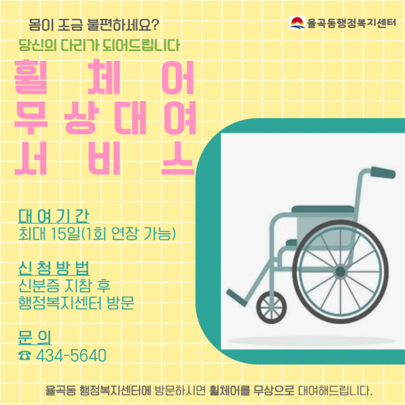 한편, 율곡동행정복지센터 맞춤형복지팀(☏421-2467)에서는 이날부터 「휠체어 무상대여서비스」를 시행하며, 일시적으로 거동이 불편한 주민들은 치료 기간에 따라 최대 30일까지 휠체어를 무료로 이용할 수 있다. |