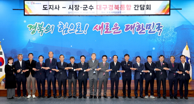 |  | | | ⓒ 김천내일신문 | | 경상북도는 11월8일 도청 화백당에서 이철우 도지사와 시장, 군수를 포함한 주요 관계자들이 참석한 가운데 『도지사-시장군수 대구경북통합 간담회』를 개최했다.