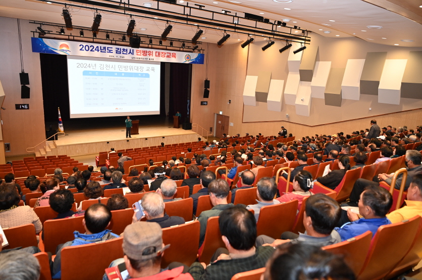 | 김천시는 11월 8일 김천시립 율곡도서관 율곡홀에서 관내 지역 및 직장민방위대장 500여 명을 대상으로 ‘2024년 민방위대장교육’을 실시했다고 밝혔다. 민방위 대장교육은 국가와 지역사회 재난에 대한 예방ㆍ 대비ㆍ 복구 등 생활안전 역량을 제고하고 민방위 사태 발생 시 대장의 대처능력을 강화하기 위해 매년 김천시 주관으로 실시하고 있다.