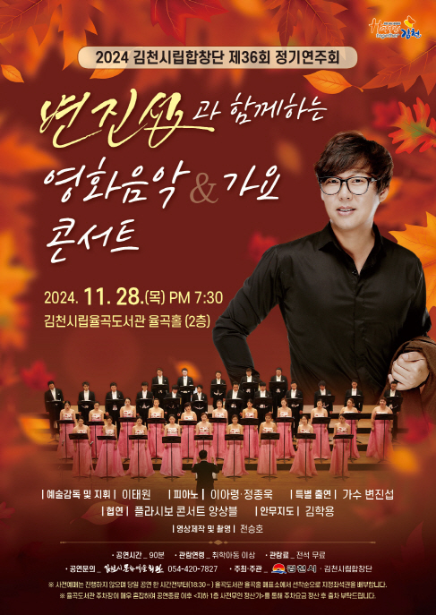 | 김천시 문화예술회관(관장 윤숙이)이 오는 11월 28일 오후 7시30분에 시립율곡도서관 율곡홀에서 시립합창단 제36회 정기연주회『변진섭과 함께하는 영화음악&가요 콘서트』를 선보인다고 밝혔다.