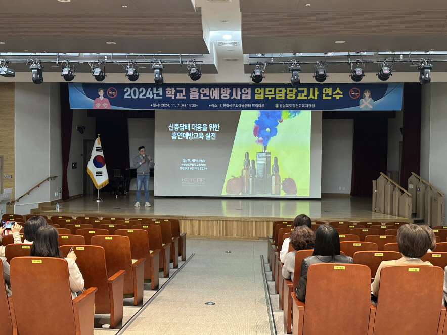 | 경상북도김천교육지원청(교육장 모태화)은 11월 7일 김천시 학생문화예술센터에서 지역 내 초·중·고등학교 흡연예방사업 업무 담당교사 50여 명을 대상으로 흡연예방사업 역량 강화 연수를 실시하였다.
