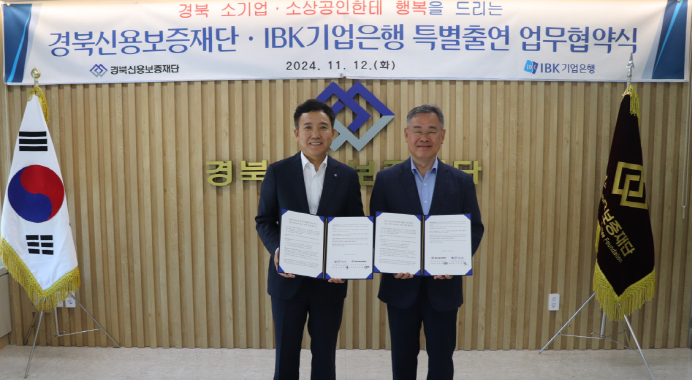 | 경북신용보증재단은 지난 11월 12일 어려움을 겪고 있는 도내 소상공인 경영위기 극복과 저출생 문제 해소를 위해 기업은행과 「2024년 기업은행-경북신용보증재단 소소한 행복 특별출연 협약보증」을 위한 업무협약을 체결했다.