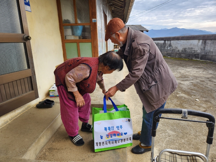 | 개령면 지역사회보장협의체(위원장 박상도)는 11월 15일 독거노인과 복지사각지대 가구에 안부물품을 전달하며 지역 주민들의 건강과 안녕을 기원하는 따뜻한 나눔의 손길을 이어갔다.