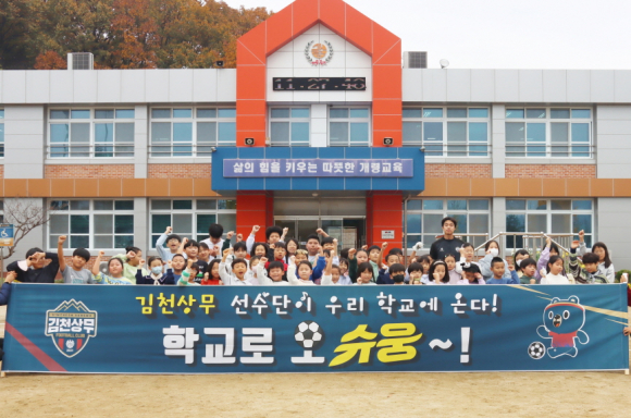 | 김천상무프로축구단(대표이사 배낙호)이 11월 15일, 개령초등학교를 방문하여 ‘학교로 오슈웅’ 축구교실을 진행했다. 이번 행사에는 김천상무 U12 한대희 감독, 이용성 코치의 지도 아래 1학년부터 6학년까지 개령초 전교생 57명이 참가하였다.