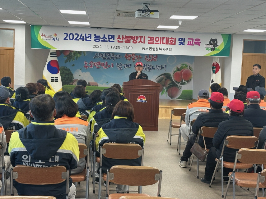 | 농소면(면장 김성봉)은 지난 11월 19일 김천시 가을철 산불대책기간(11월 1일 ~ 12월 31일)이 도래함에 따라 농소·율곡 의용소방대원, 산불감시원, 주민이 참여한 가운데 ‘2024년 가을철 산불방지를 위한 산불예방 결의대회’를 개최했다.