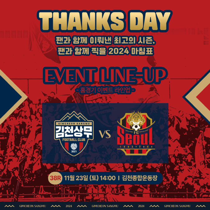 | 김천상무프로축구단(대표이사 배낙호)이 11월 23일, ‘하나은행 K리그1 2024’ 38R FC서울(이하 서울)전에서 ‘THANKS DAY’ 홈경기 이벤트를 진행한다. 김천상무는 2024시즌 마지막 홈경기를 맞아 2024년 한 해 동안 감사한 마음을 담아 다양하고 풍성한 이벤트와 증정품으로 팬을 맞이한다.