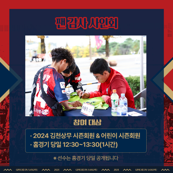 김천상무는 시즌회원(어린이 시즌회원 포함)을 대상으로 한 특별 이벤트도 준비했다. 먼저, 팬 사인회에 참여하는 2인의 선수가 프로선수단을 대표해 시즌회원에게 감사한 마음을 전한다. 이어 여러 가지 구단 MD상품을 받을 수 있는 ‘꽝 없는 럭키드로우’도 준비한다. 하프타임에는 시즌회원 대상 추첨을 통해 프로선수단 친필사인 유니폼 액자와 파이널 라운드 사용 공인구 및 케이스를 각 1명에게 증정한다.