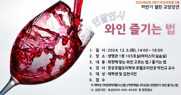 도서관 강좌는 김천대학교 생명관 1층 105호실(바리스타 실습실)에서 진행되며, 이번 회차에서는 항공호텔조리학부 호텔조리전공 박인규 교수를 초청하여 “연말연시 와인 즐기는 법” 주제로 와인에 대한 상식과 함께 와인을 즐기는 노하우에 대하여 진행할 예정이다.