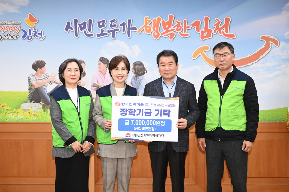 | 김천시인재양성재단은 지난 11월 25일 김천의 교육 발전과 미래인재 양성을 위해 한국전력기술(주) 전력기술연구원(원장 설영실)이 700만 원의 장학 기금을 전달했다고 밝혔다.
