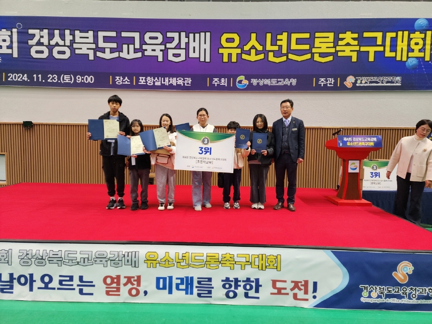 | 대룡초등학교(교장 박창욱)는 지난 11월 23일 경상북도교육청 주최로 열린 제4회 경상북도교육감배 유소년드론축구대회에 참가하여 초등학교부 3위라는 뛰어난 성과를 거두었다. 이번 대회는 청소년들의 창의적 탐구력을 높이고 소질을 계발하여 미래 핵심 산업인 드론 분야 인재를 양성하는 것을 목적으로 마련된 대회이다.