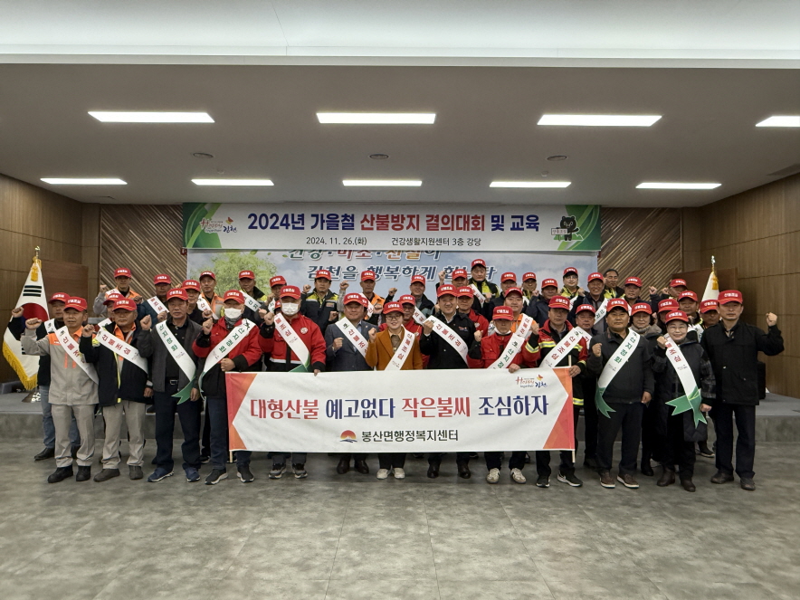 | 김천 봉산면행정복지센터(면장 한종국)는 11월 26일에 봉산면 건강생활지원센터 3층 강당에서 산불 예방과 산림 보호의 중요성을 알리고 주민 참여를 독려하기 위해 산불방지 결의대회를 개최했다