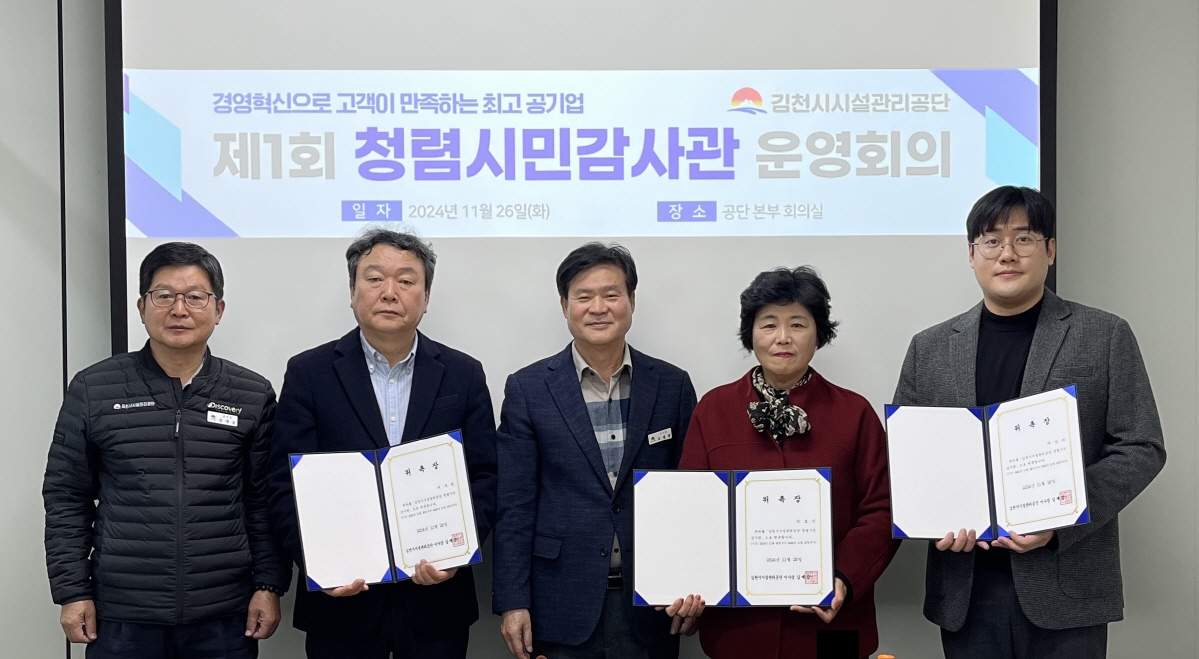 | 김천시 시설관리공단(이사장 김재광)은 공정하고 투명한 경영을 실현하고, 시민과의 소통을 강화하기 위해 청렴시민감사관 제도를 새롭게 도입하고, 지난 11월 26일 청렴시민감사관 3인을 신규 위촉했다고 밝혔다.