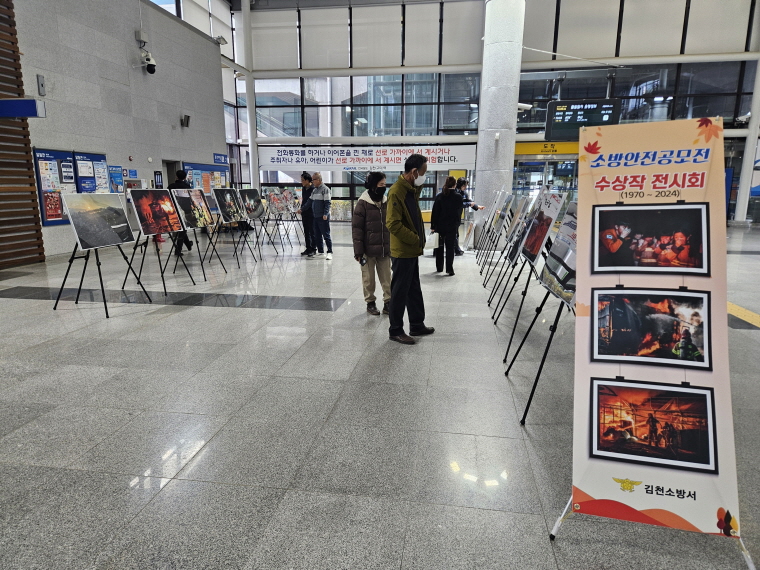| 김천소방서는 11월 불조심 강조의 달을 맞아 지난 11월 28일 ‘김천구미역’ 광장에서 역대 소방안전공모전 수상작 전시회를 개최했다고 밝혔다.