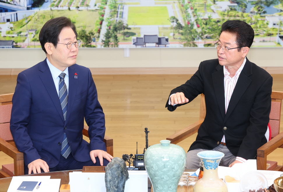 이에 대해 이재명 대표는 “통합의 방향을 이해하며 지방행정체제는 장기적으로 광역화하고 재정의 독립성, 행정자율성, 자치분권과 권한 강화가 중요하다”고 화답했다.