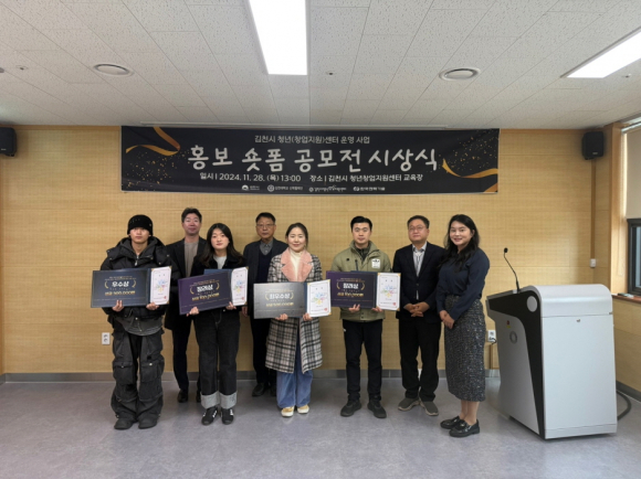 | 김천대학교(총장 윤옥현) 산학협력단(단장 윤경식)은 지난 11월28일, 김천시 청년창업지원센터에서 『김천시 청년창업지원센터 홍보 숏폼 공모전 시상식』을 개최했다. 이번 공모전은 김천시가 주최하고 김천대학교 산학협력단, 김천시 청년창업지원센터가 주관, 한국전력기술(주)이 후원하였다고 2일 밝혔다.