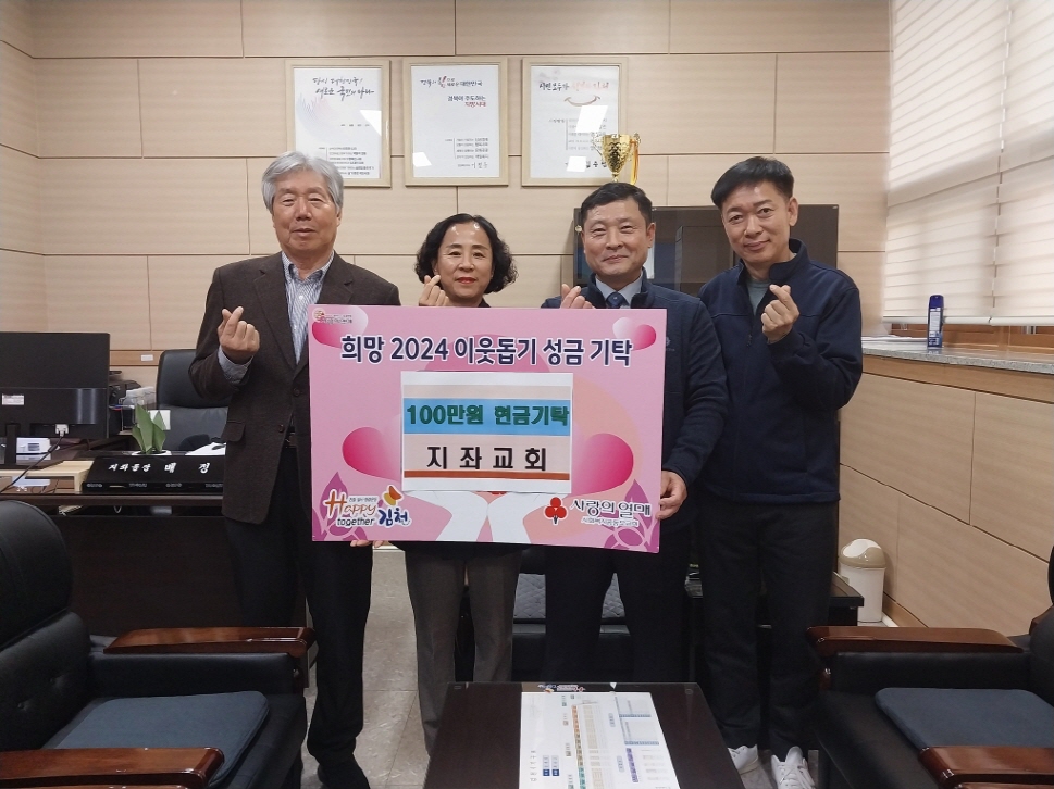 | 김천시 지좌동 지좌교회(목사 장철한)는 12월 2일 지좌동행정복지센터(동장 배정화)를 방문하여 이웃돕기 성금 100만 원을 전달했다.